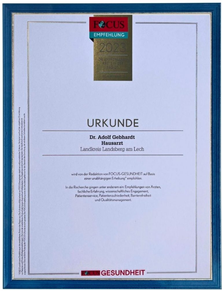 Im Jahr 2023 wurden wir vom FOCUS Magazin als empfohlene Hausarztpraxis ausgezeichnet – eine Anerkennung für fachliche Kompetenz, Patientenzufriedenheit und Servicequalität.